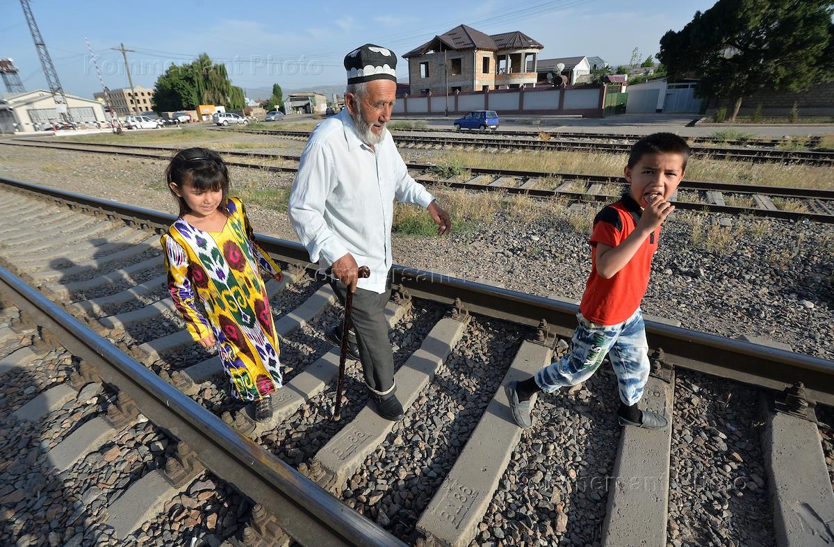 Жанровая фотография. Дедушка с внуками идут по шпалам железной дороги.