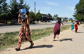 Виды Душанбе. Женщина пьет воду из шланга для полива.