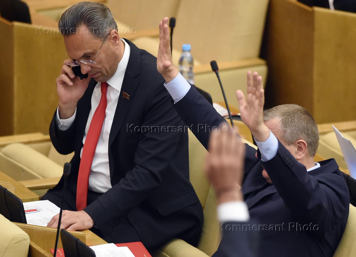 Председатель комитета Государственной думы России по конституционному законодательству и государственному строительству Владимир Плигин (слева) и заместитель председателя комитета ГД России по энергетике Павел Завальный (в центре) на пленарном заседании Госдумы России .