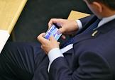 Пленарное заседание Государственной думы России. Жанровая фотография. Депутат смотрит по мобильному телефону видеозапись с участием автомобиля.