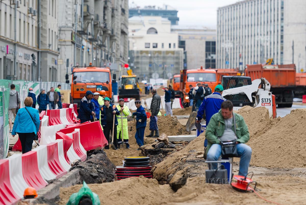 Движение автомобилей во время работы по реконструкции и благоустройсту улиц Москвы в рамках программы "Моя улица".