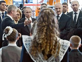 Рабочая поездка президента России Владимира Путина в Минск. Президент России Владимир Путин (в центре) и президент Белоруссии Александр Лукашенко (слева) перед началом российско-белорусских переговоров в Минске.