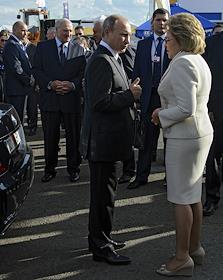 Рабочая поездка президента России Владимира Путина в Минск. Президент Белоруссии Александр Лукашенко (второй слева), президент России Владимир Путин (в центре) и председатель Совета Федерации России Валентина Матвиенко (справа) на выставке "БЕЛАГРО-2016".