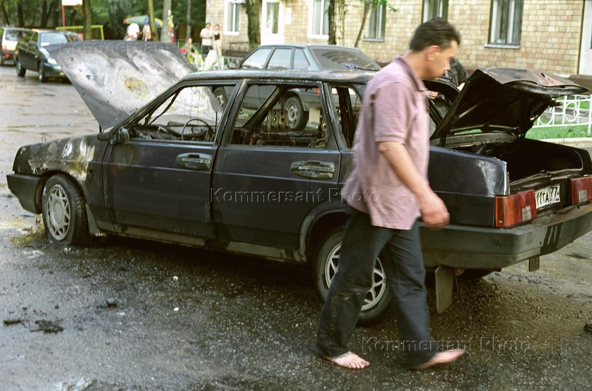 Burned-out car VAZ 2109 stands at the yard.