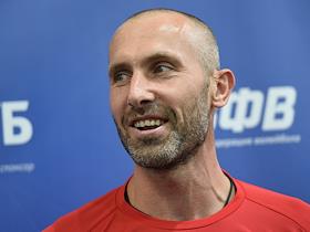 Открытая тренировка мужской сборной России по волейболу прошла в рамках пресс-тура для журналистов в УТЦ "Новогорск". Игроки сборной России по волейболу Сергей Тетюхин во время тренировки.