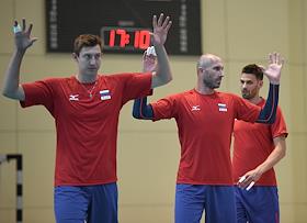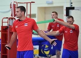 Открытая тренировка мужской сборной России по волейболу прошла в рамках пресс-тура для журналистов в УТЦ "Новогорск". Игроки сборной России по волейболу слева направо: Дмитрий Волков, Сергей Тетюхин и Лукаш Дивиш во время тренировки.