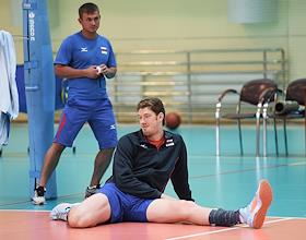 Открытая тренировка мужской сборной России по волейболу прошла в рамках пресс-тура для журналистов в УТЦ "Новогорск". Игрок сборной России по волейболу Александр Маркин (слева) во время тренировки.