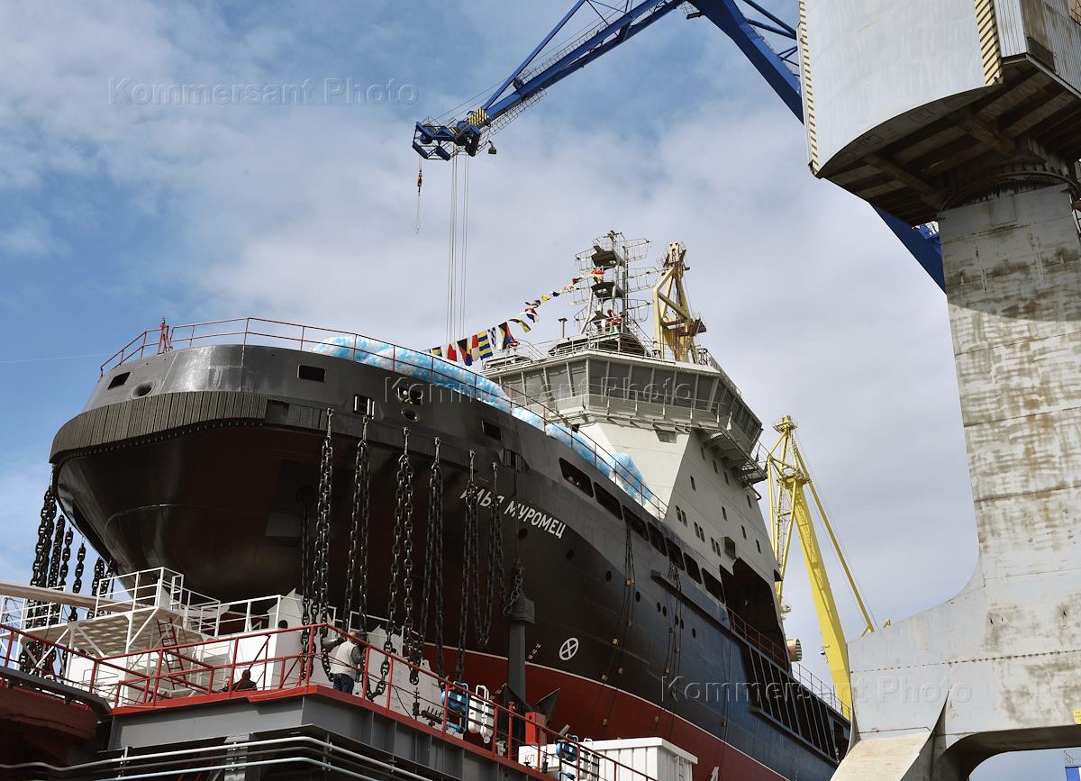 АО "Адмиралтейские верфи". Торжественная церемония спуска на воду ледокола "Илья Муромец" проекта 21180 для Военно-морского флота (ВМФ) России.