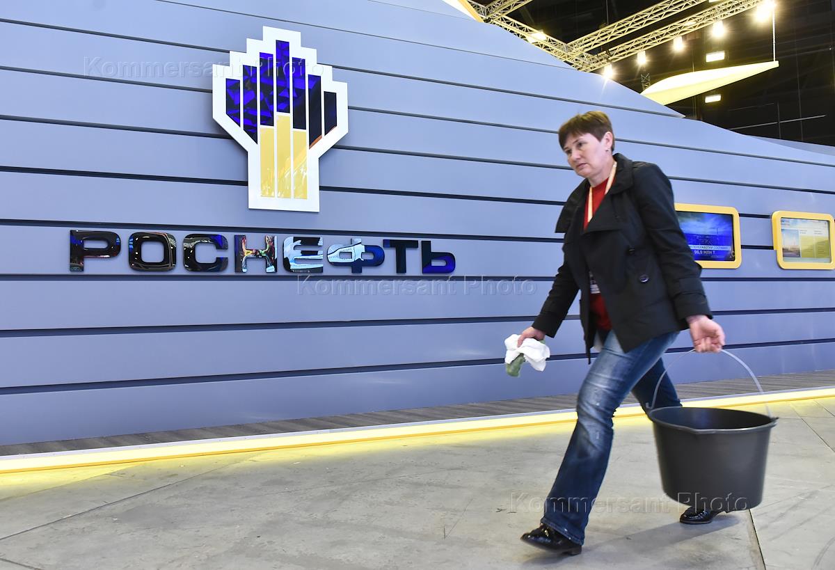 Петербургский Международный экономический форум 2016 (ПМЭФ). Подготовка к проведению форума. Женщина с ведром у рекламного стенда Роснефти.