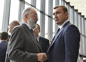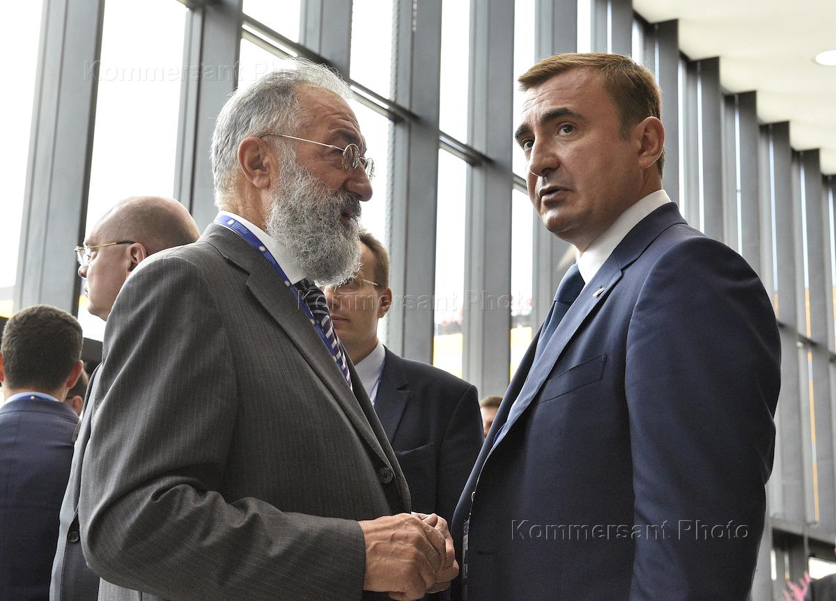 ХХ Петербургский международный экономический форум (ПМЭФ) 2016 прошел в Конгрессно-выставочном центре "Экспофорум". Первый вице-президент по переработке и коммерции, член правления ОАО АНК "Башнефть" Али Узденов (слева) и председатель совета директоров АФК "Система" Владимир Евтушенков (справа) перед началом панельной сессии "Как вести экономику на траекторию устойчивого роста?".
