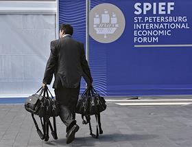 ХХ Петербургский международный экономический форум (ПМЭФ) 2016 прошел в Конгрессно-выставочном центре "Экспофорум". Жанровая фотография. Участник форума несет портфели-органайзеры участников ПМЭФ-2016.