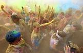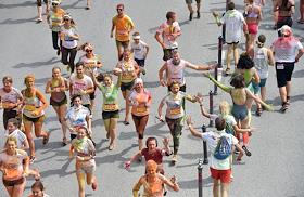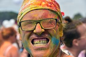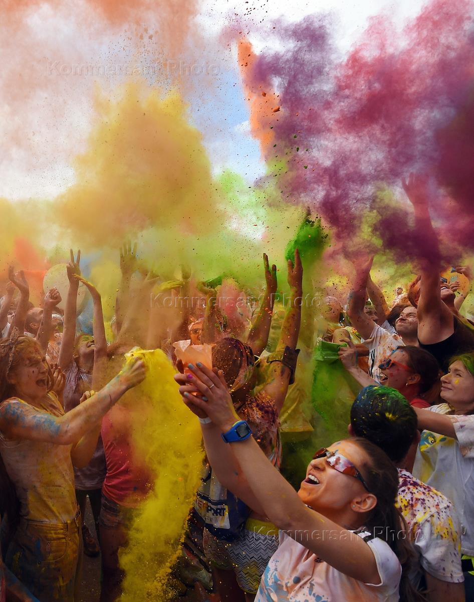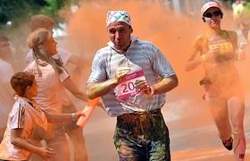 «Московский Марафон» — Красочный забег - прошел вокруг Олимпийского комплекса «Лужники» по Новолужнецкому проезду и Лужнецкой набережной. Участники марафона во время обсыпания яркими красками.