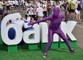 Участники "Московского Марафона" — Красочного забега по маршруту вокруг Олимпийского комплекса "Лужники" по Новолужнецкому проезду и Лужнецкой набережной, где в четырех красочных зонах волонтеры обсыпят их яркими красками. Реклама "Промсвязьбанка".