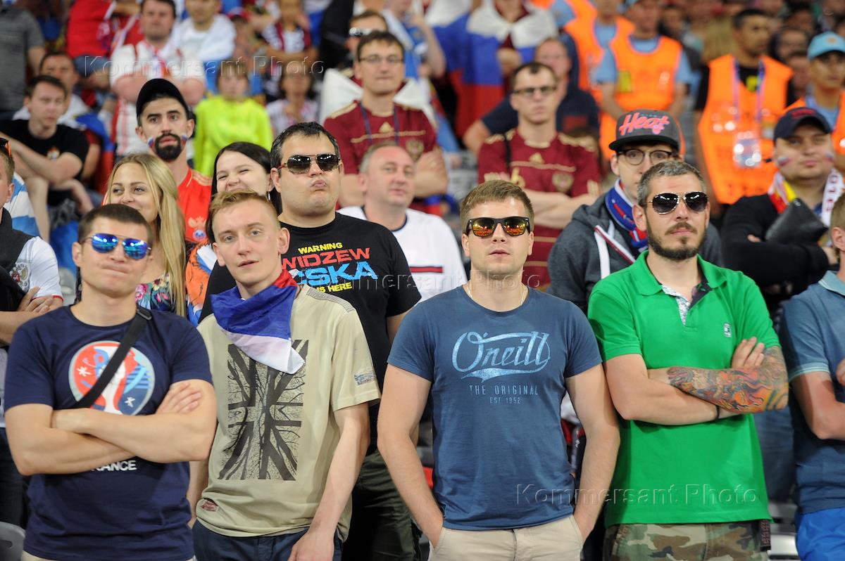 The 2016 UEFA European Championship. The preliminary round of the B group. The match between teamd of Russia and Wales at the stadium 'Municipal'. Fans of the Russian team on stands of the stadium during the match.