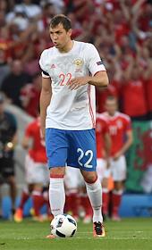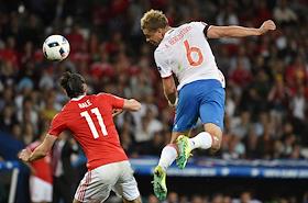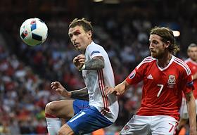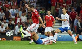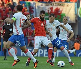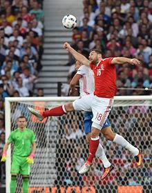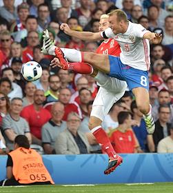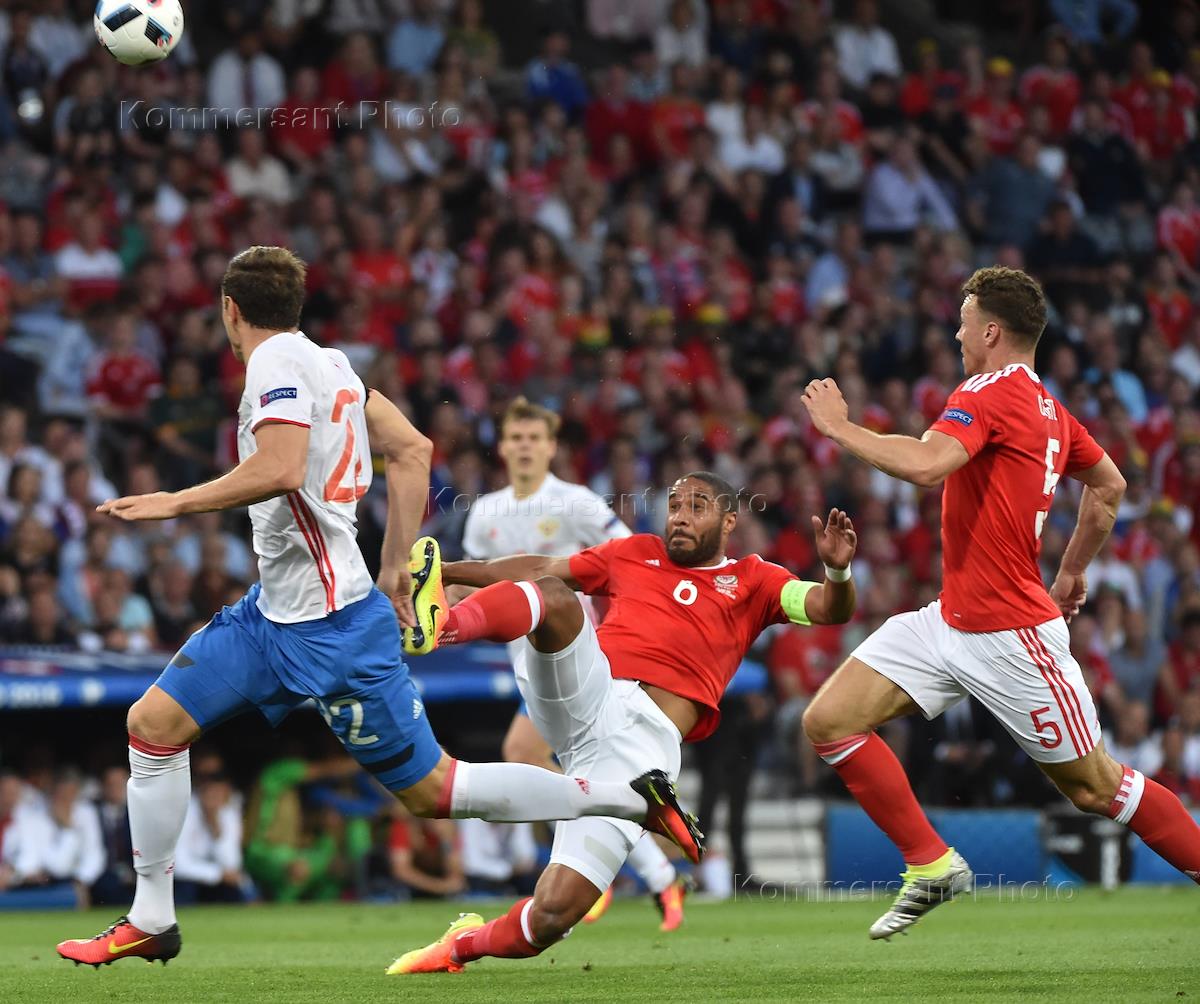 The 2016 UEFA European Championship. The preliminary round of the B group. The match between teamd of Russia and Wales at the stadium 'Municipal'. Player of the Russian team Sergey Ignashevich (left) and player of the team of Wales Sam Vokes (right) are during the match.