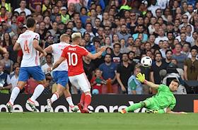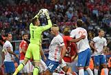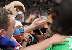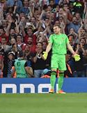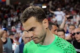 The 2016 UEFA European Championship. The preliminary round of the B group. The match between teamd of Russia and Wales at the stadium 'Municipal'. Goalkeeper of the Russian team Igor Akinfeev (right) is after the match.