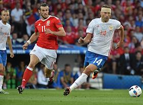The 2016 UEFA European Championship. The preliminary round of the B group. The match between teamd of Russia and Wales at the stadium 'Municipal'. Player of the Russian team Andrey Beresutsky (right) and player of the team of Wales Gareth Bale (left) are during the match.