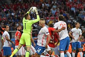 The 2016 UEFA European Championship. The preliminary round of the B group. The match between teamd of Russia and Wales at the stadium 'Municipal'. Goalkeeper of the Russian team Igor Akinfeev is during the match.