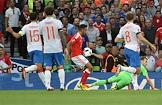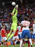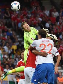 The 2016 UEFA European Championship. The preliminary round of the B group. The match between teamd of Russia and Wales at the stadium 'Municipal'. Goalkeeper of the Russian team Igor Akinfeev (right) is during the match.