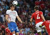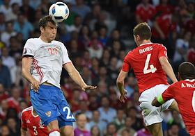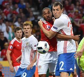 The 2016 UEFA European Championship. The preliminary round of the B group. The match between teamd of Russia and Wales at the stadium 'Municipal'. Football-player of the Russian team Sergey Ignashevich (right) and player of the team of Wales Sam Vokes (left) are during the match.
