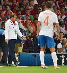 The 2016 UEFA European Championship. The preliminary round of the B group. The match between teamd of Russia and Wales at the stadium 'Municipal'. Chief coach of the Russian team Leonid Slutsky (left) is during the match.