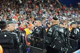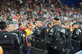 The 2016 UEFA European Championship. The preliminary round of the B group. The match between teamd of Russia and Wales at the stadium 'Municipal'. Policemen of France are on watch at the stadium during the match.