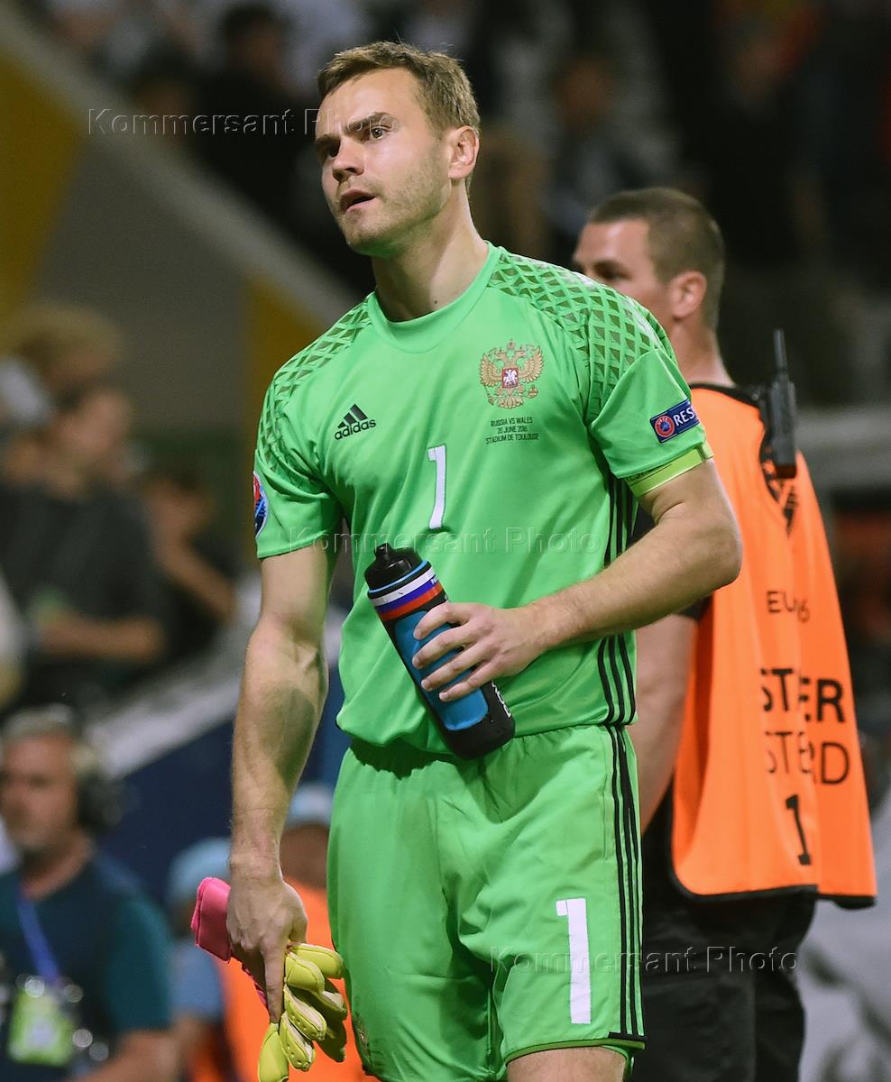 The 2016 UEFA European Championship. The preliminary round of the B group. The match between teamd of Russia and Wales at the stadium 'Municipal'. Goalkeeper of the Russian team Igor Akinfeev is during the match.