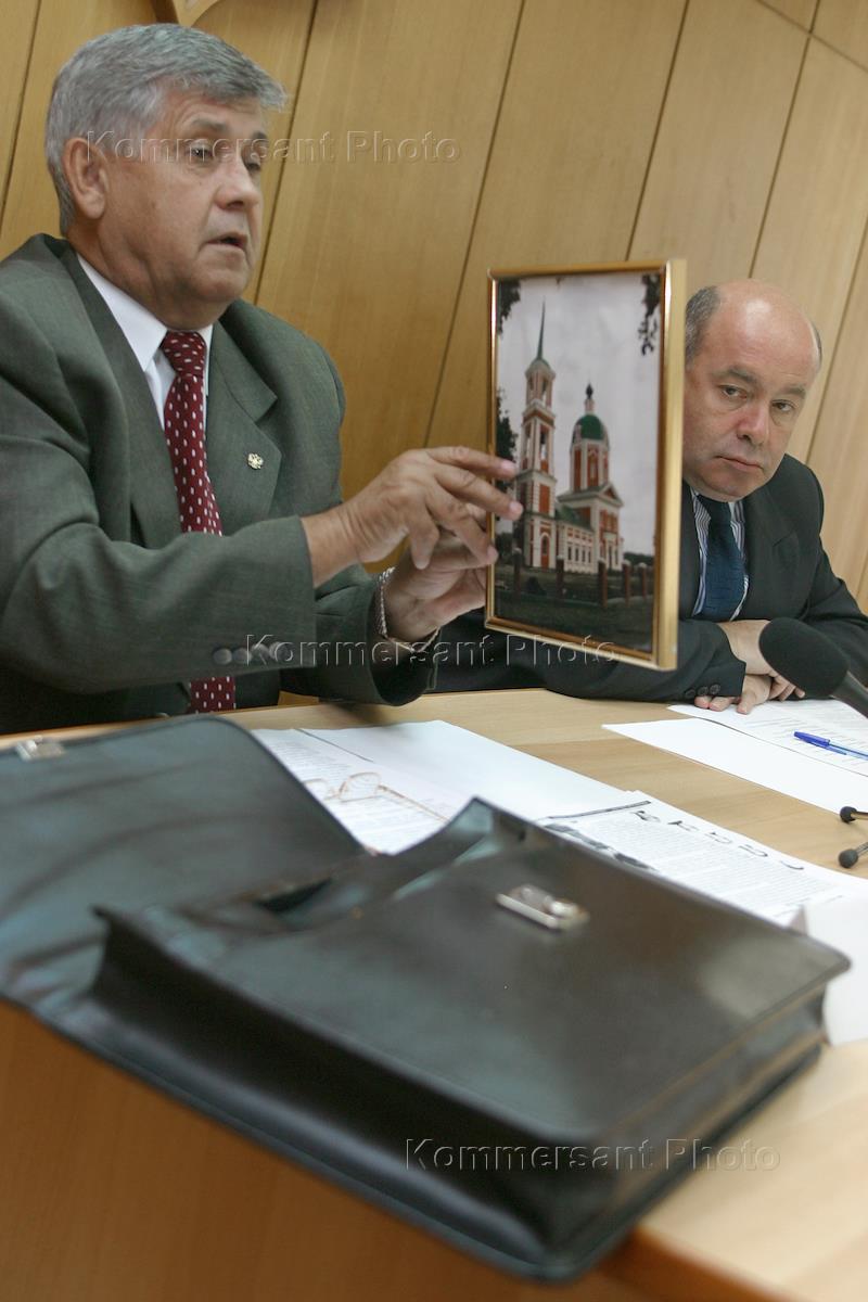 Губернатор Брянской области Юрий Лодкин (слева) и министр культуры России Михаил Швыдкой (справа) на пресс-конференции, в ходе которой была представлена программа празднования 200-летия со дня рождения Федора Тютчева. Пресс-конференция состоялась в здании министерства культуры РФ.