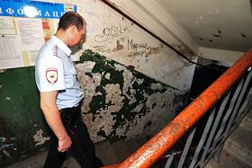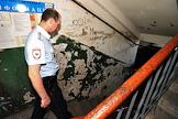 Участковый на лестнице многоквартирного дома во время рейда по квартирам должников представителей компании Газпрома по газораспределению на Дальнем Востоке.