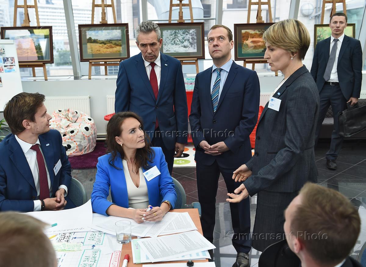 Председатель Внешэкономбанка Сергей Горьков (слева) и председатель правительства России Дмитрий Медведев (в центре) перед началом заседания наблюдательного совета Внешэкономбанка.
