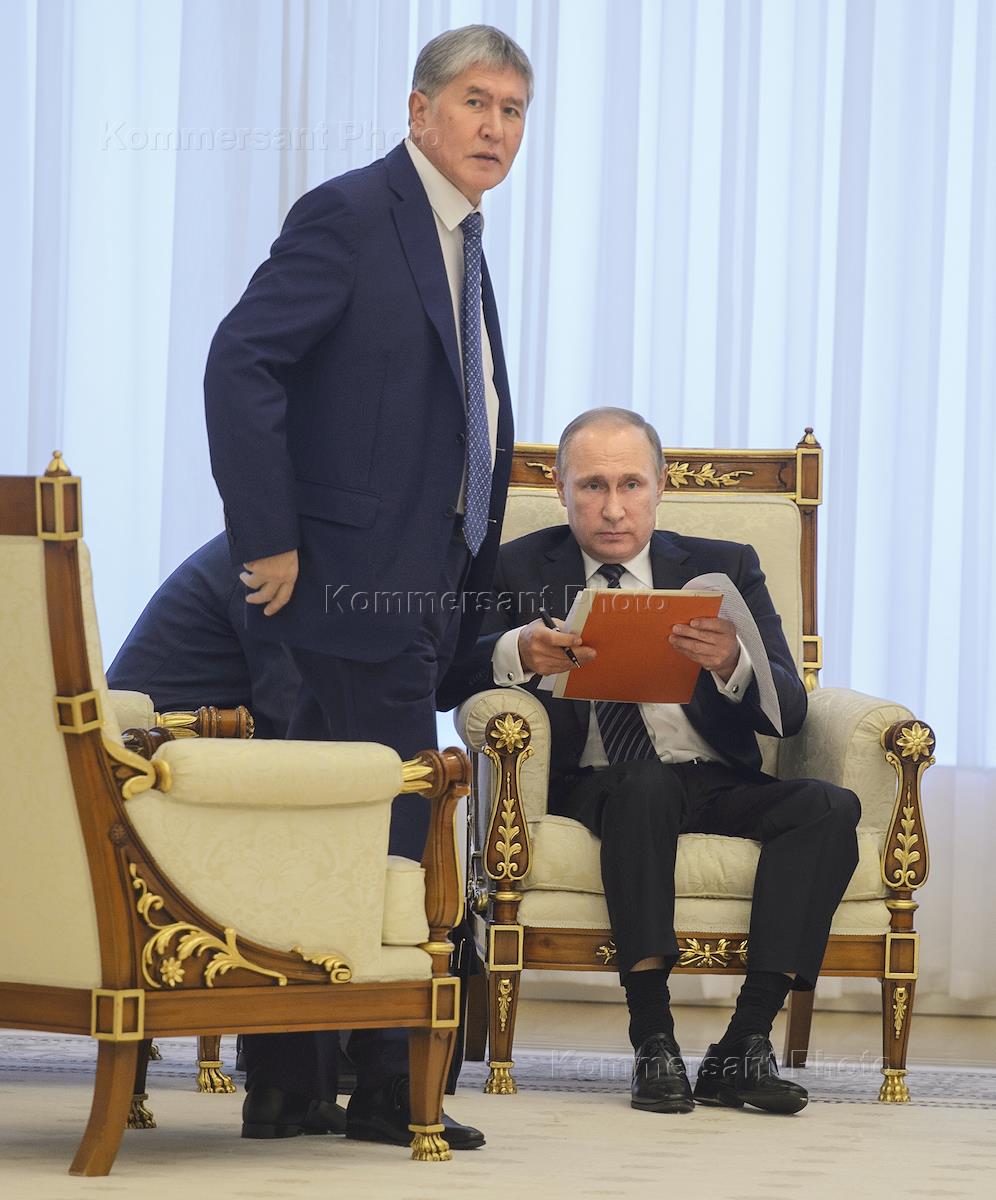 Президент Киргизской Республики Алмазбек Атамбаев (слева) и президент России Владимир Путин (справа) во время встречи перед началом заседания Совета глав государств-членов Шанхайской организации сотрудничества (ШОС) в расширенном составе, приуроченного к 15-летию создания ШОС.