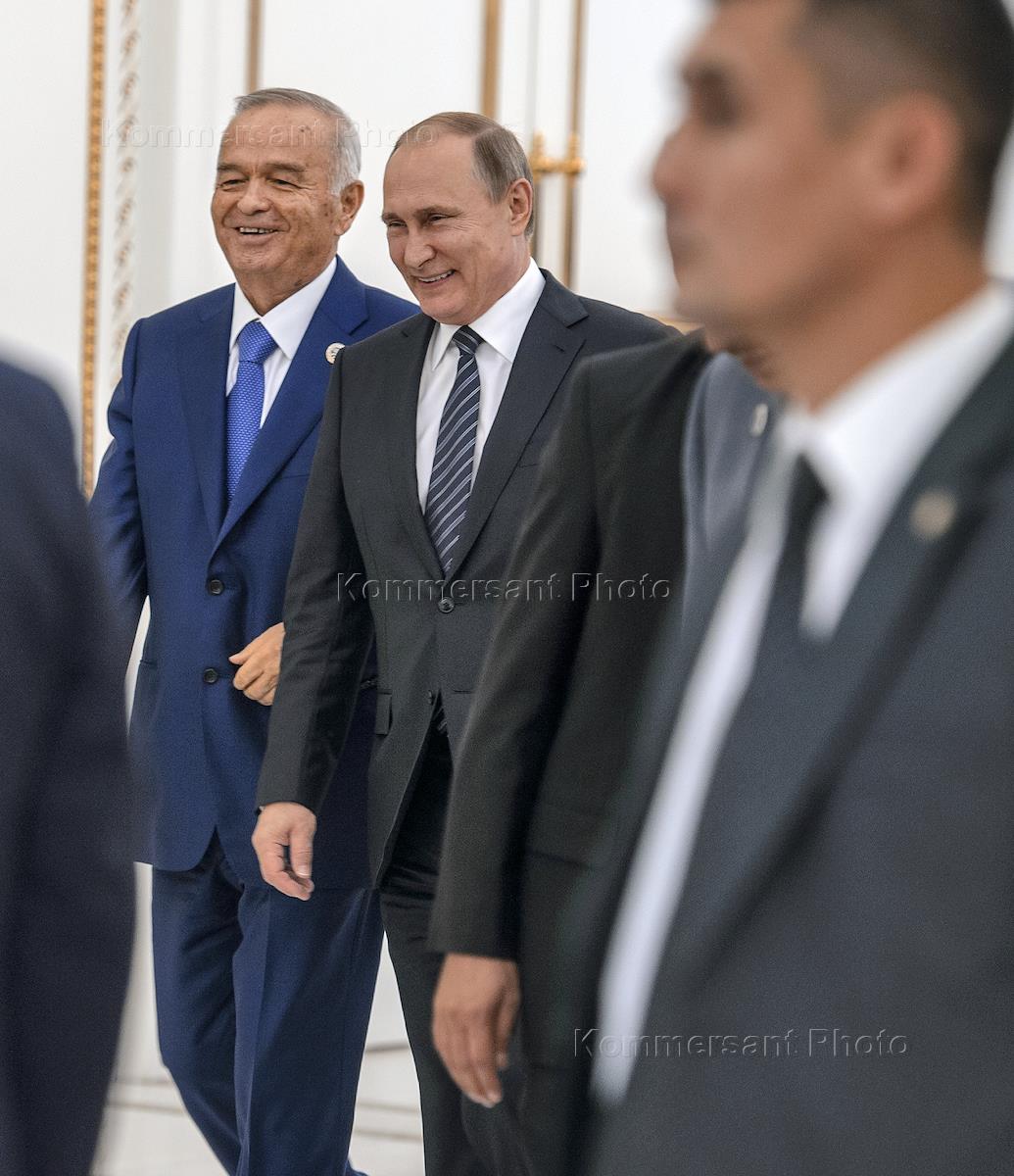 Президент Республики Узбекистан Ислам Каримов (слева) и президент России Владимир Путин (справа) перед началом заседания Совета глав государств-членов Шанхайской организации сотрудничества (ШОС) в расширенном составе, приуроченного к 15-летию создания ШОС.