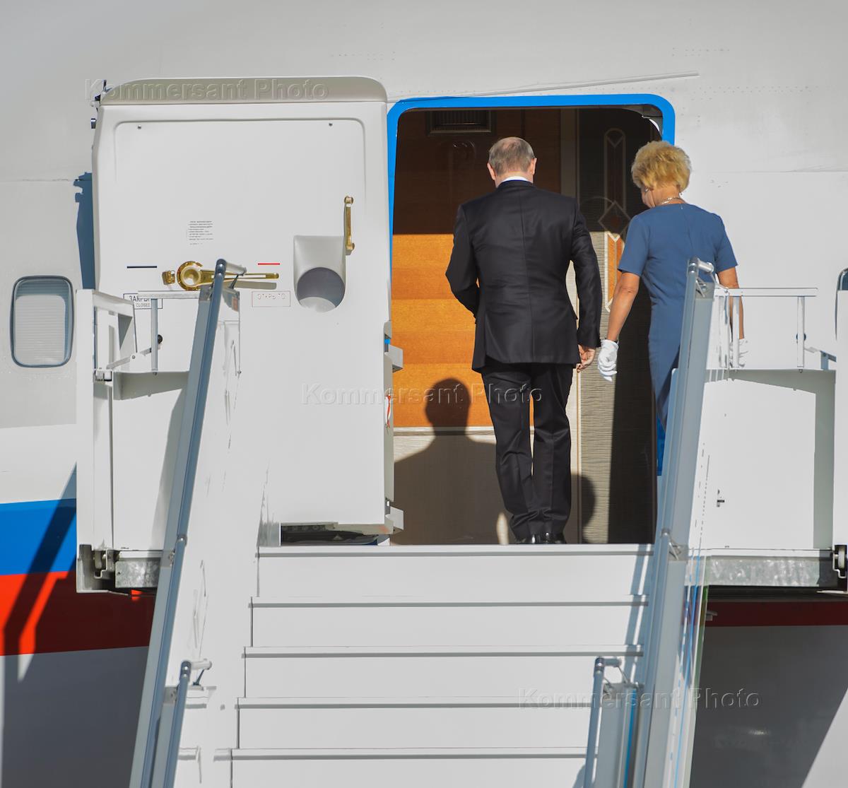 Рабочая поездка президента России Владимира Путина в Ташкент. Президент России Владимир Путин (слева) перед началом вылета из аэропорта Ташкента.