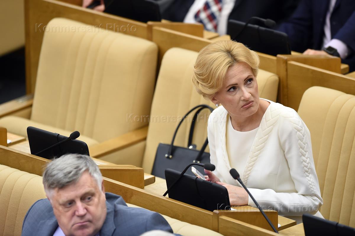 Председатель комитета Государственной думы (ГД) России по безопасности и противодействию коррупции Ирина Яровая (справа) во время последнего пленарного заседания ГД России шестого созыва, заканчивающей свою работы в этом составе.