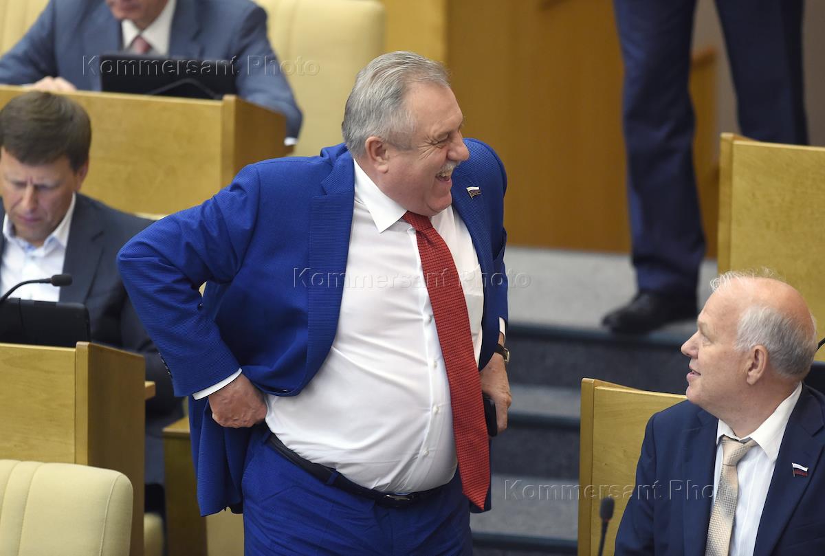 Член комитета Гударственной думы (ГД) России по безопасности и противодействию коррупции Анатолий Шеин (в центре) и заместитель председателя комитета ГД России по экологии Анатолий Грешневиков (справа) во время последнего пленарного заседания ГД России шестого созыва, заканчивающей свою работы в этом составе.