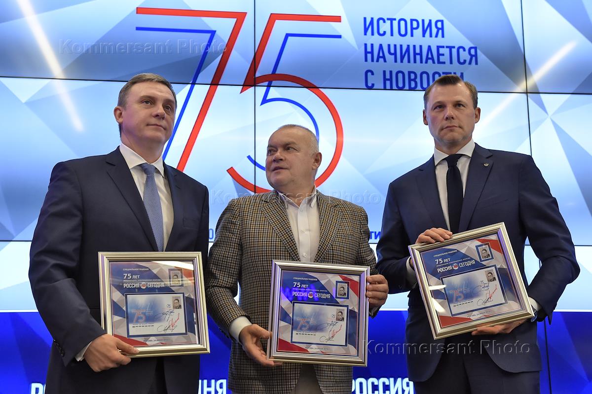 Генеральный директор МИА "Россия сегодня" Дмитрий Киселев (справа) на церемонии памятного гашения художественной почтовой марки, посвященной 75-летию со дня основания Международного информационного агентства МИА "Россия сегодня" - "Совинформбюро".