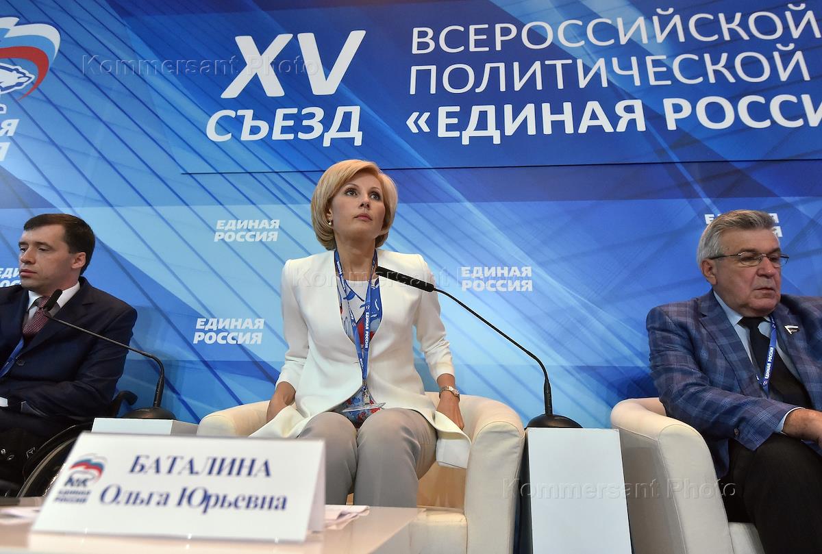 The second part of the 15th congress of the party 'United Russia'. The first day of the congress working. Chairwoman of the labour, social policy and veterans' affairs committee of the Russian State Duma Olga Batalina (in the centre) is during the congress working in the central exhibition hall 'Manege'.