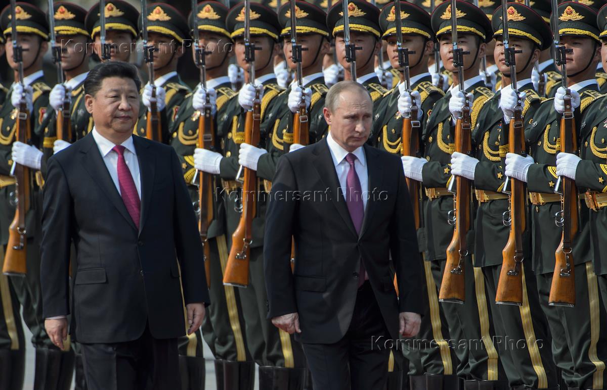 Рабочая поездка президента России Владимира Путина в Пекин. Председатель Китайской Народной Республики (КНР) Си Цзиньпин (справа) и президент России Владимир Путин (слева) на церемонии официальной встречи.