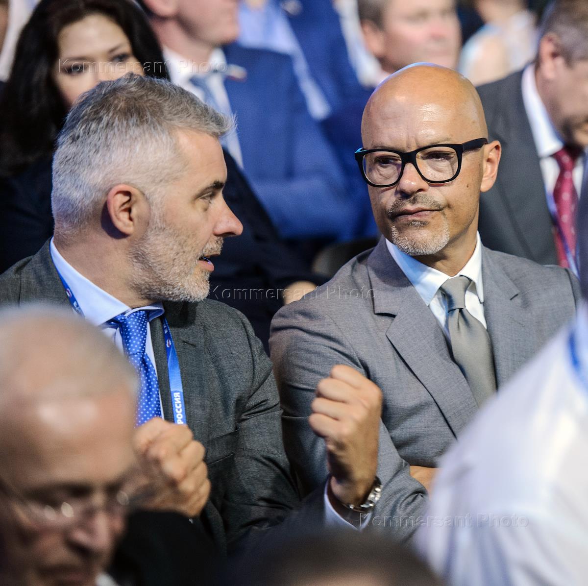 Телеведущий Петр Толстой (слева) на XV съезде Всероссийской политической партии "Единая Россия" .