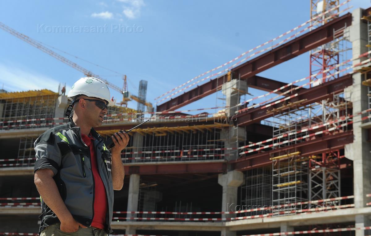 Рабочие на строительстве нового терминала аэропорта Домодедово, которое будет закончено к началу чемпионату мира по футболу 2018 г. "Красная зона" строительной площадки.