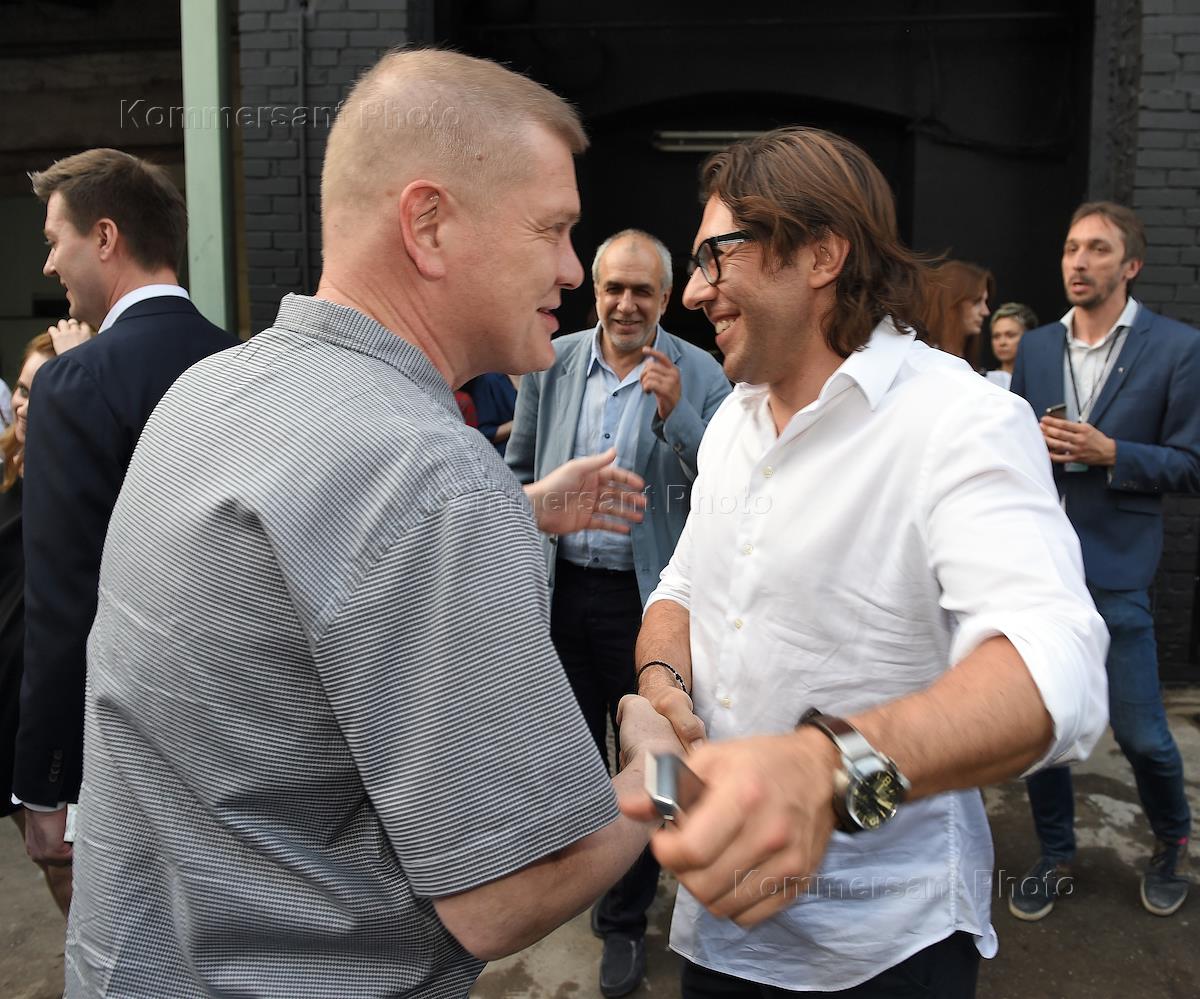 Церемония открытия V Московской международной биеннале молодого искусства на территории "Трехгорной мануфактуры". Председатель президиума Фонда развития современного искусства Иван Демидов (слева) и телеведущий Андрей Малахов (справа) на церемонии.
