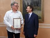 Обозреватель газеты "КоммерсантЪ" Виктор Хамраев (слева) во время встречи председателя Государственной думы России Сергея Нарышкина (справа) с журналистами, аккредитованными при Государственной думе России.