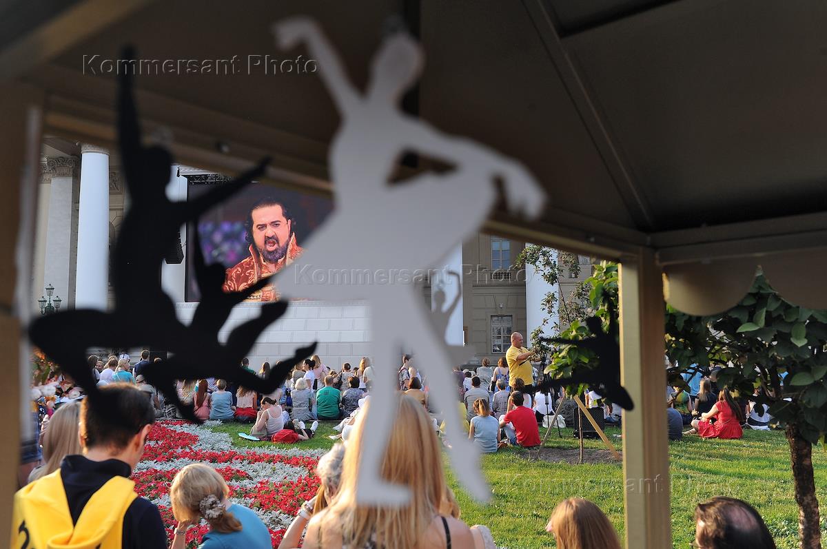 Зрители во время трансляции оперы Римского-Корсакова "Царская невеста" в постановке Государственного академического Большого театра (ГАБТ)на фасаде ГАБТ.