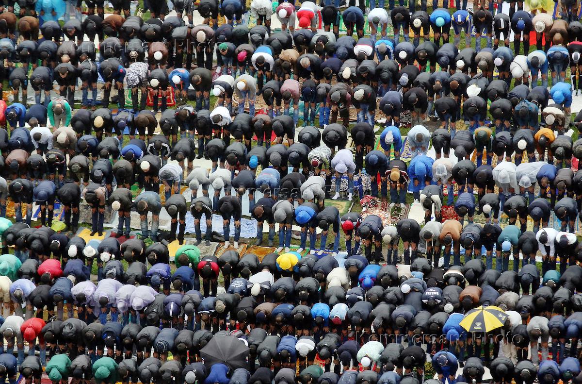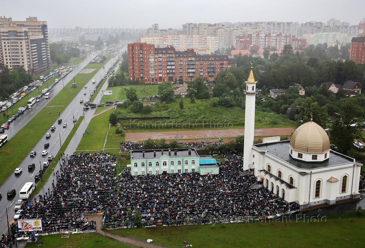 Мусульмане во время торжественного намаза по случаю праздника Ураза-байрам у квартальной Мечети на пересечении улиц Репищева и Парашютной.