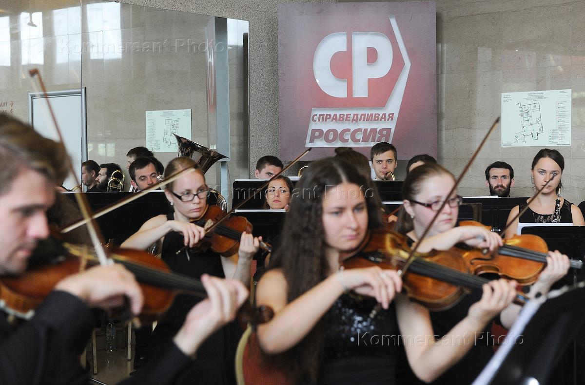 VIII съезд партии "Справедливая Россия" прошел в концертном зале гостиницы "Космос". Выступление симфонического оркестра в фойе гостиницы.