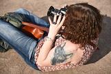 Жанровая фотография. Девушка на песке во время съемки фотоаппаратом.