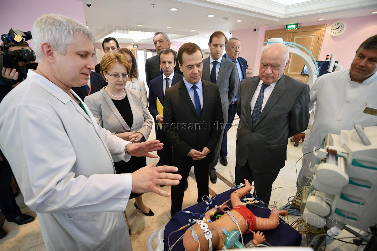 Председатель правительства России Дмитрий Медведев (в центре), министр здравоохранения России Вероника Скворцова (слева), заместитель председателя правительства России Аркадий Дворкович (второй слева) и директор Научного центра сердечно-сосудистой хирургии имени А.Н. Бакулева Лео Бокерия (справа) во время посещения Научного центра сердечно-сосудистой хирургии имени А.Н. Бакулева.