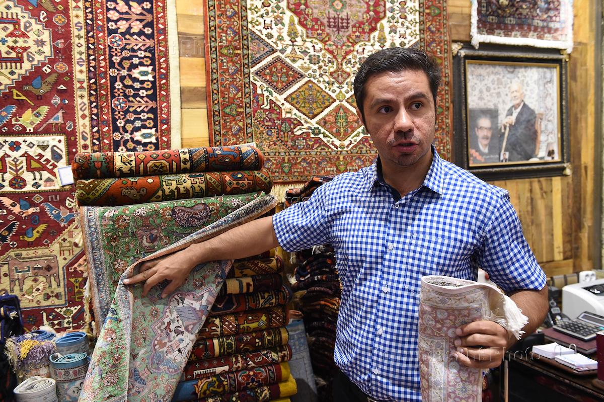 Виды Тегерана. Менеджер по продаже ковров Овит во время демонстрации изделий.