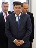 Международная промышленная выставка "Иннопром-2016" прошла в выставочном центре "Екатеринбург-Экспо". День второй. Первый заместитель председателя правительства Свердловской области Алексей Орлов (слева) и губернатор Свердловской области Евгений Куйвашев (в центре), министр промышленности Свердловской области Сергей Пересторонин (справа) перед началом подписания трехстороннего соглашения, по строительству высокоскоростной магистрали между Челябинском и Екатеринбургом.