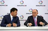 Международная промышленная выставка "Иннопром-2016" прошла в выставочном центре "Екатеринбург-Экспо". День второй. Губернатор Свердловской области Евгений Куйвашев (слева) и губернатор Челябинской области Борис Дубровский (справа) во время подписания трехстороннего соглашения, по строительству высокоскоростной магистрали между Челябинском и Екатеринбургом.